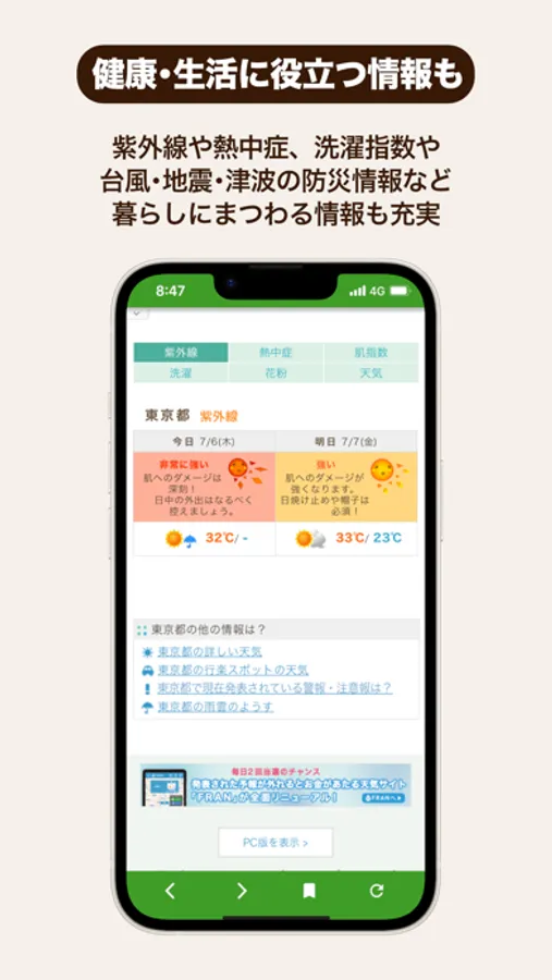 紫外線や熱中症などの季節に応じた健康予報や洗濯情報など、生活に密着した情報を掲載。