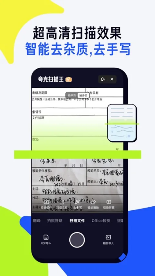 夸克扫描王是一款文件高效处理软件, 让纸质文件摆脱束缚, 用手机便捷扫描自动优化, 让文件整理更智能。