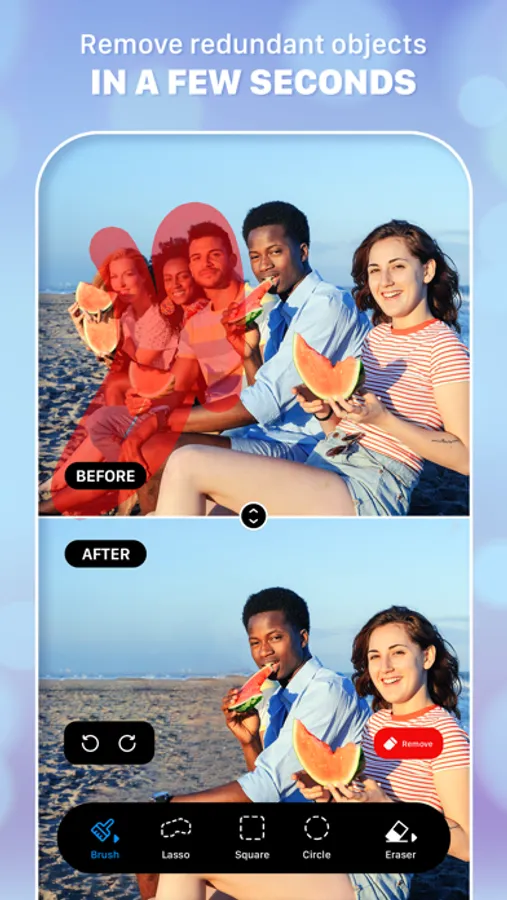 Remove the background with just one tap then AI will handle it for you. Especially, now you can remove any unwanted objects with a Swipe of your finger using magic retouch.
