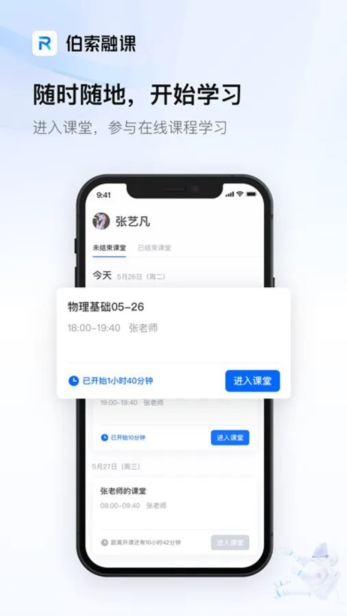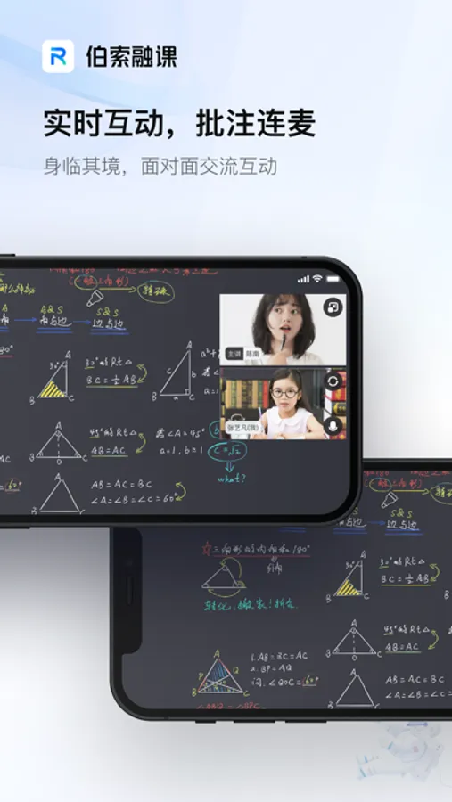 伯索融课是伯索网络科技有限公司为学校实现双师课堂、互动课堂、直播课堂,而打造的一款基于iOS的线上学习应用,学生可以观看主讲老师的直播课堂,并进行音视频交流互动。