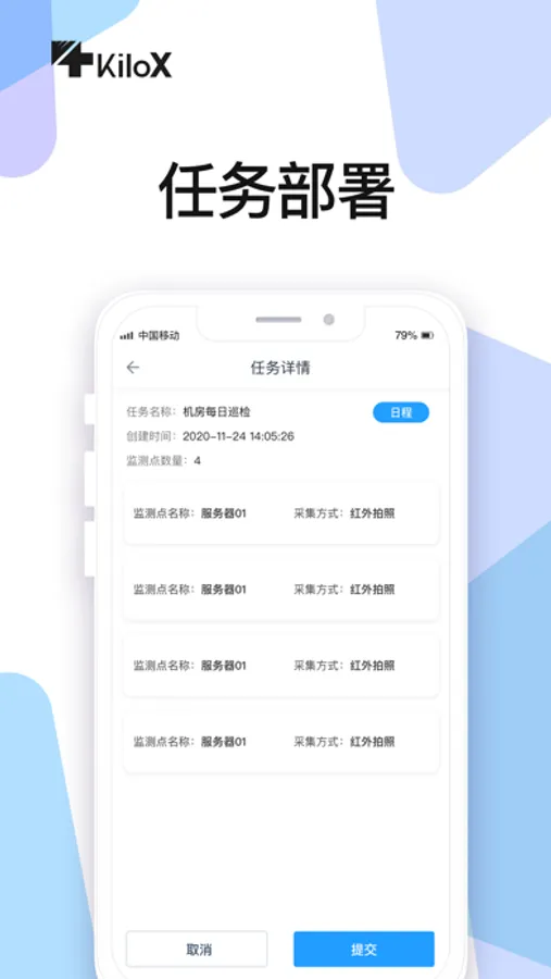 巡检手持终端(Inspection Handheld Terminal,简称:IHT),侧重对人员的调度,巡检人员可触达其他采集终端不便采集的单任务,如需要开柜门的点位,通过拍照、录音、录像、文本、红外测温等方式采集巡检数据,生成巡检记录。