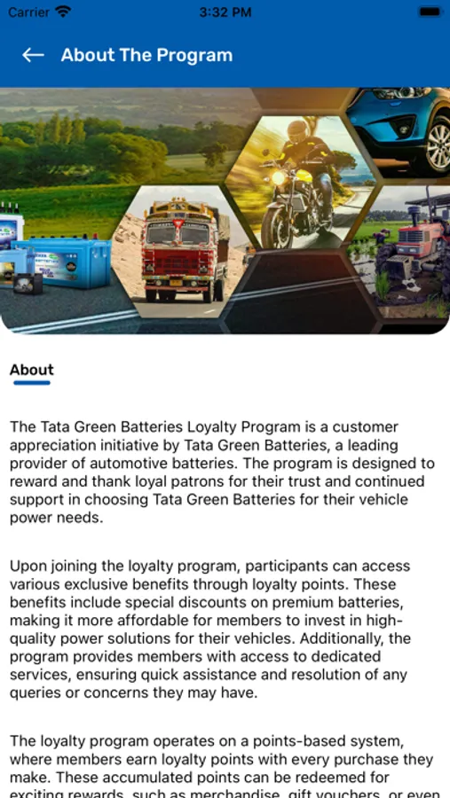 Tata Green Batteries Loyalty Program is an initiative designed to reward and appreciate our loyal patrons. As a leading provider of automotive batteries, we value our buyers' trust and continued support. With this loyalty program, we aim to give back and express our gratitude to those who choose Tata Green Batteries for their vehicle power needs.