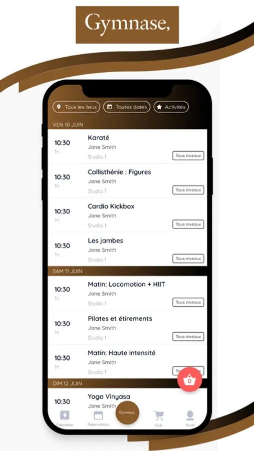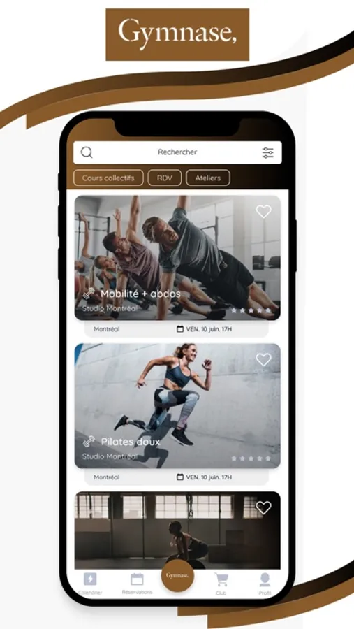 Elle vous permettra de réserver vos classes, d’acheter vos abonnements ainsi que de faire vos achats dans notre boutique en ligne. Elle vous permettra aussi d’accéder à Gymnase TV, notre bibliothèque de vidéos sur demande. Exemple de classes offertes : Callisthénie, Locomotion, Pilates et posture, Haute intensité, Mobilité, Longévité…