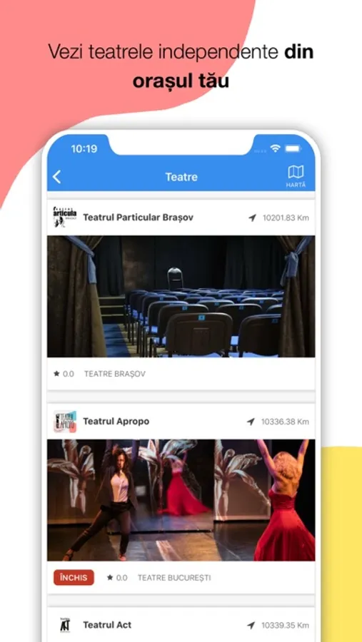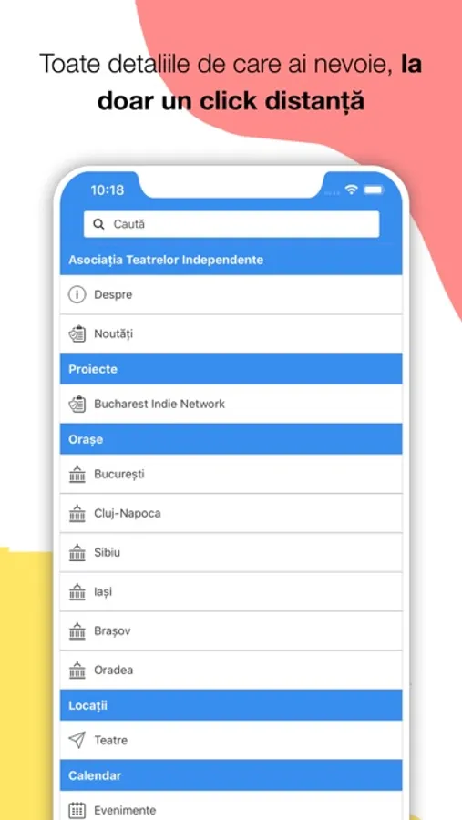 Aplicația Teatru independent îți oferă posibilitatea de a descoperi cele mai noi spectacole de teatru, dans, muzică, ale instituțiilor de artele spectacolului, independente, din România. Programul evenimentelor și locațiile sunt acum disponibile direct pe telefonul tău mobil.