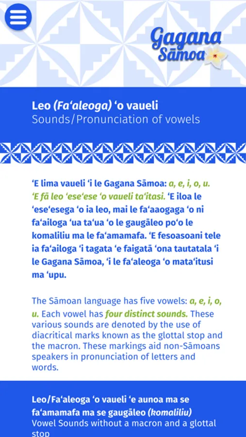This app is a tool to learn, pronounce, spell and speak the Sāmoan Language. This is also the contribution of the Si’ufofoga ‘o le Laumua Trust to grow, maintain and retain the Sāmoan Language. Producing this app is a great innovative way for people to learn & speak the Samoan language. When swiping your finger across a letter, word, or sentence in the Samoan language on this app, you can hear how to say and pronounce the same. We have used the original spelling of the Samoan words with Glottal stop and macron as found in the early publications of the Samoan Bible. This will greatly assist second language learners with the pronunciation of vowels and words.