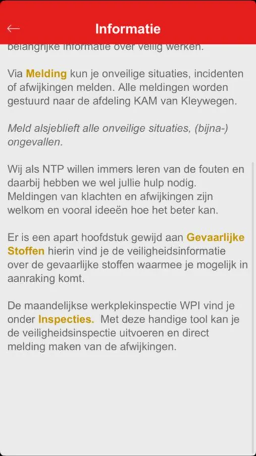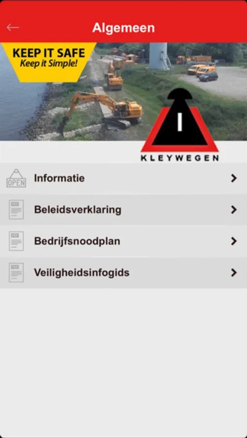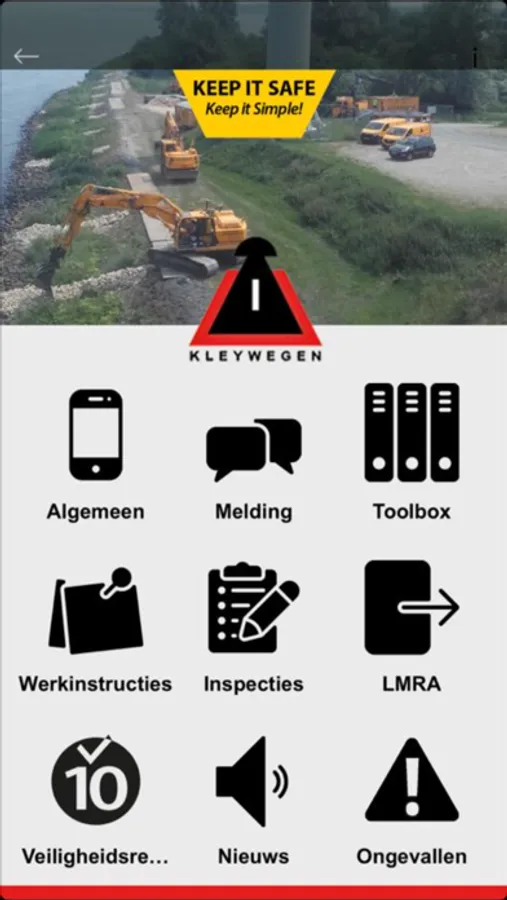 Dit is de Veiligheidsapp van Kleywegen. Hierin staat alles over wat te doen bij onveilige situaties en kunnen onveilige situaties gemeld worden. Regelmatig wordt er nieuwe informatie over veilig werken in deze app geplaatst en er kunnen werkplek inspectie worden uitgevoerd.