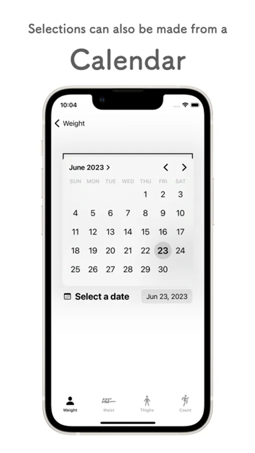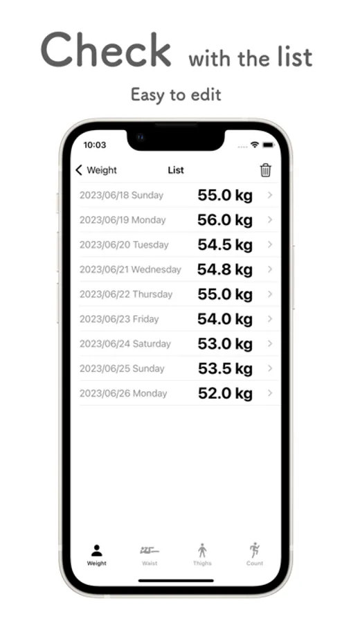 ・Zero (0) cannot be recorded for Weight, Waist, and Thighs.