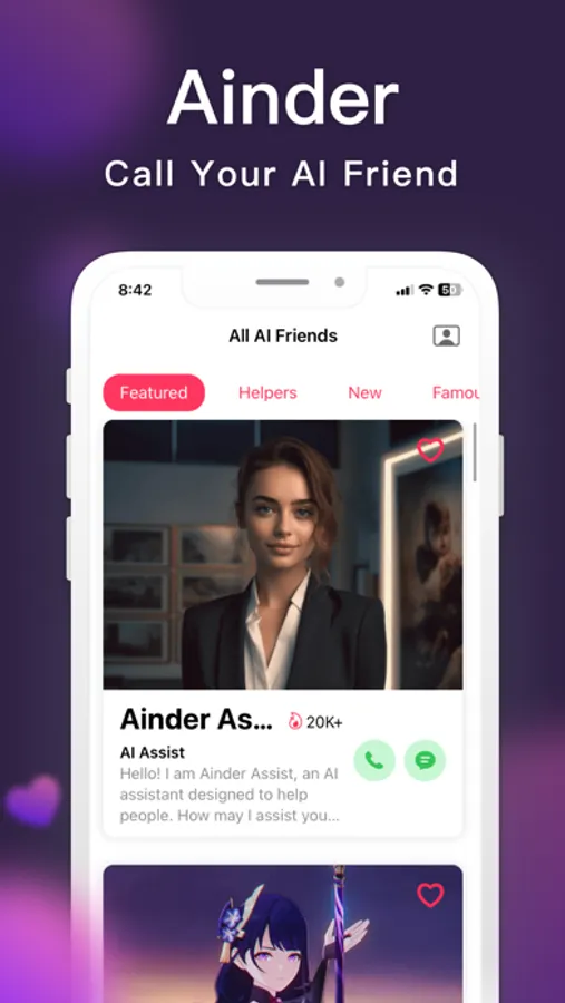 Ainder is an application that leverages artificial intelligence to enable engaging voice chat conversations. Users can view and select from an array of AI chat characters, then express their preference by either "Like" or "Nope" them. Once the user has made their selection, they can engage in exciting conversations with the character of their choice.