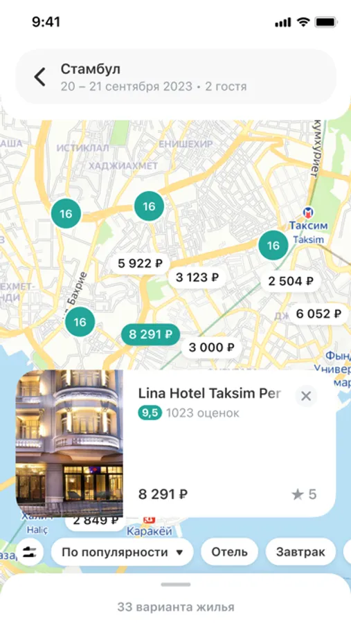 Удобное отображение отелей с ценой за выбранный период: посмотрите сразу несколько вариантов отелей рядом в выбранном районе.