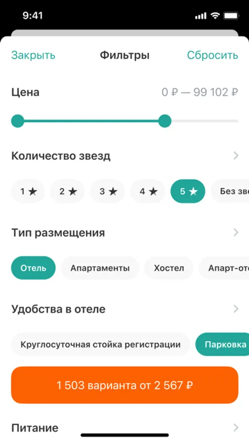 Фильтры по отзывам, бесплатной отмене, Wi-Fi, питанию, парковке и многим другим полезным параметрам.