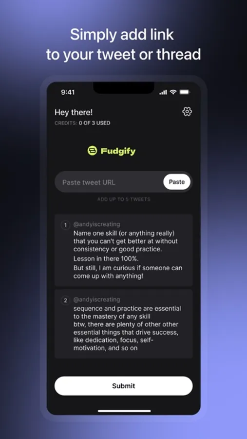 Tweet URL Integration: Fudgify makes it incredibly easy to import tweets into the app. Simply copy the tweet URL, paste it into Fudgify, and the app will extract the text and prepare it for video creation.