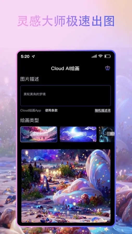 Cloud AI绘画大师将艺术创作变得更加智能、创新和灵活。无论您是寻求灵感还是追求艺术突破,Cloud AI绘画大师将成为您创作旅程中的得力伙伴,助力您实现绘画创意的无限可能。释放您的创意,让绘画由心而生。