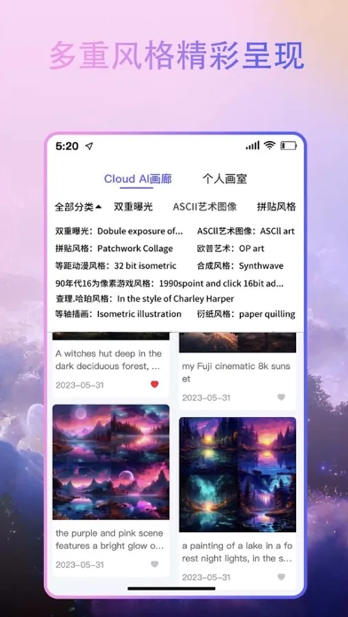 为创作灵感,Cloud AI绘画大师将通过智能算法将其转化为独特的艺术风格。用户可以选择不同的绘画效果,将图片转变为油画、水彩、铅笔画等多种艺术风格的作品。