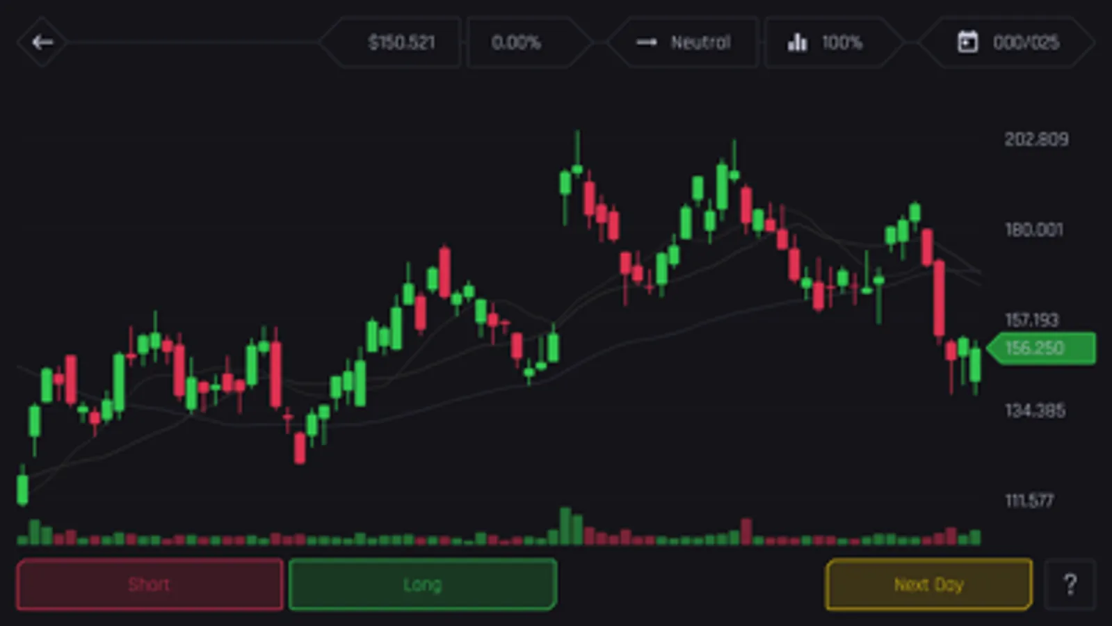 At the start of each round you get presented with a few months of historical market data to put everything in context. Based on what you see, you decide whether you want to take a position or stay in cash. Does it look like the stock will go up? Go LONG. Does it look like it will go down? Go SHORT. Not sure? Reduce the position size or close the position altogether!