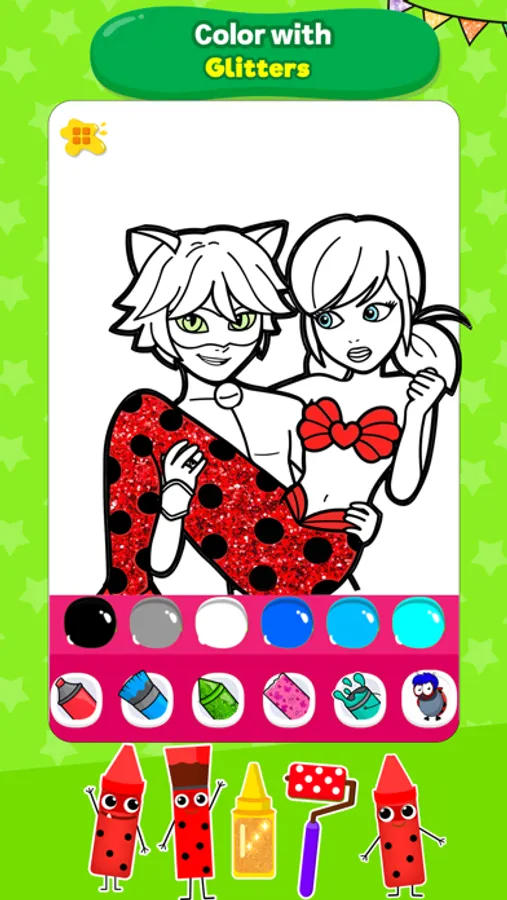 The coloring and drawing tools allows you to create unic picture with glitter color and stickers