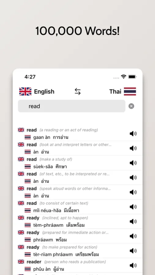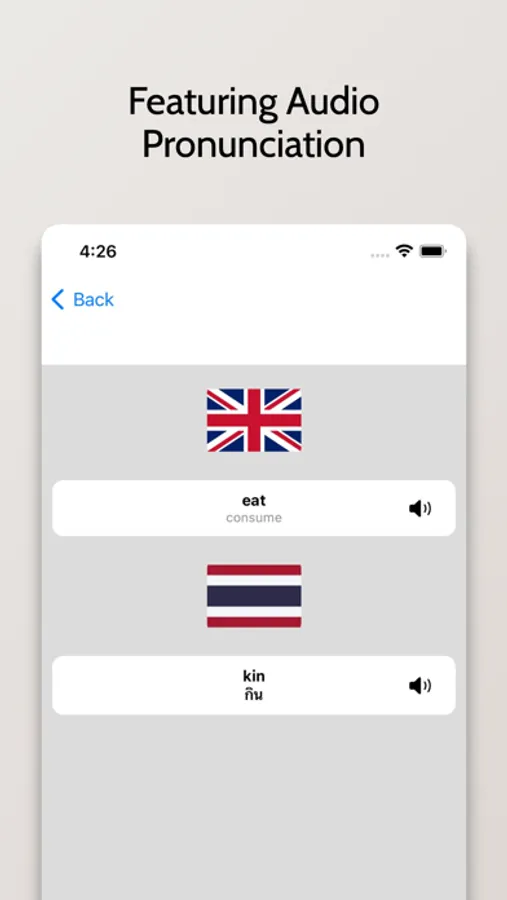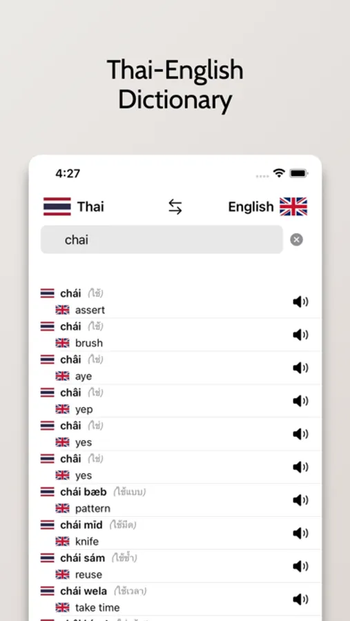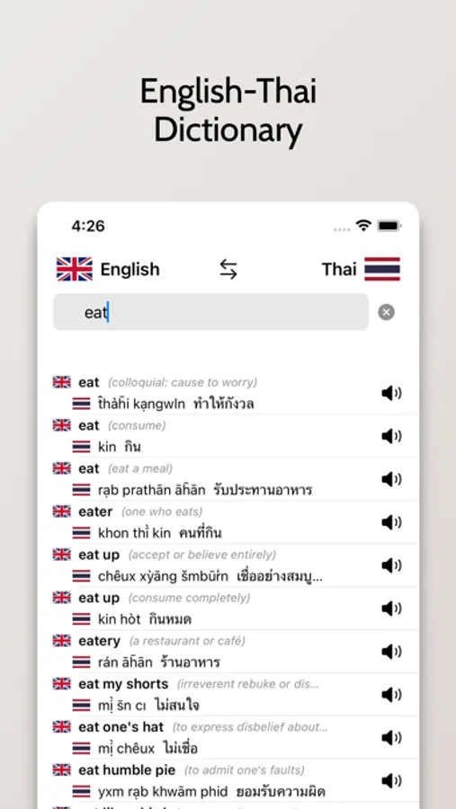 Audio Pronunciation: Not sure how to pronounce that word? No worries! Our app provides audio pronunciation in both Thai and English, helping you sound like a native.