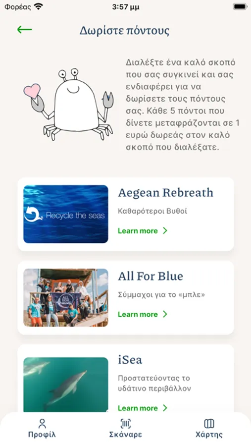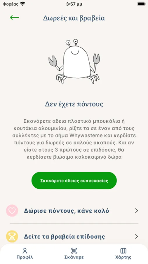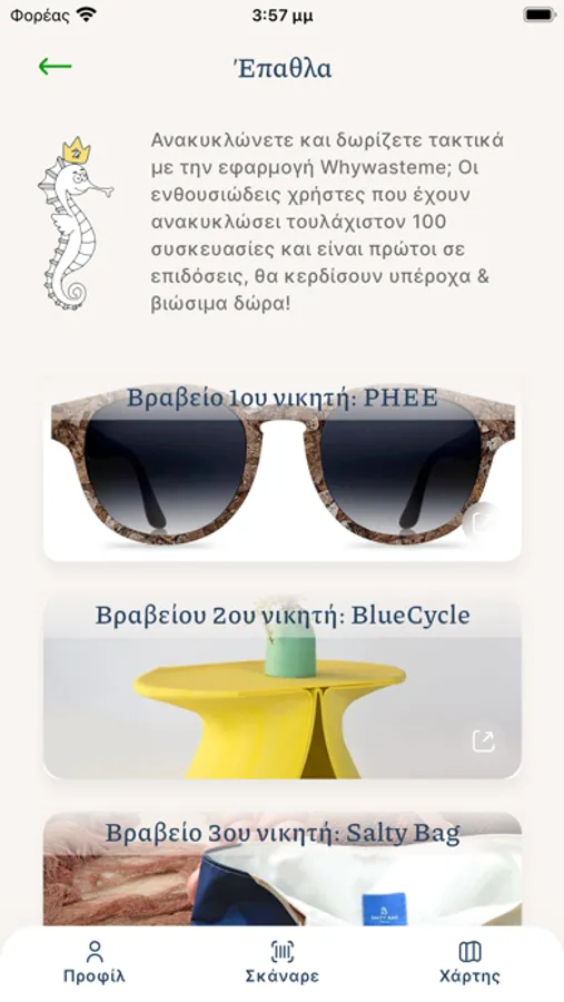 Whywasteme is a new app that connects recycling to cleaner Seas. Use the app to scan barcodes on plastic bottles or other types of single use packaging and then recycle them in one of the recycling spots shown in the app’s map. In this way, you collect points that your can donate to organisations that focus on cleaning Greek seas and coasts. The app also calculates the amount of carbon dioxide emissions that you save with every package recycled.