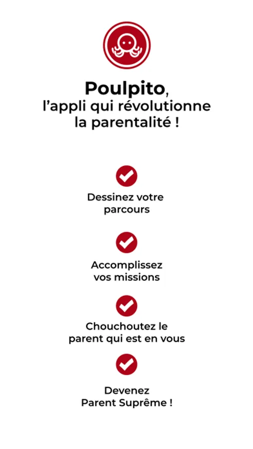 Vous en doutez ? Rejoignez au plus vite la communauté Poulpito pour vivre l’aventure au quotidien : dessinez votre parcours, accomplissez vos missions, analysez et chouchoutez le parent qui est en vous, protégez votre couple des récurrentes tentatives terroristes infantiles, gagnez en compétences parentales et devenez, enfin, Parent Suprême !