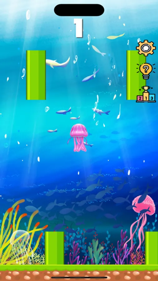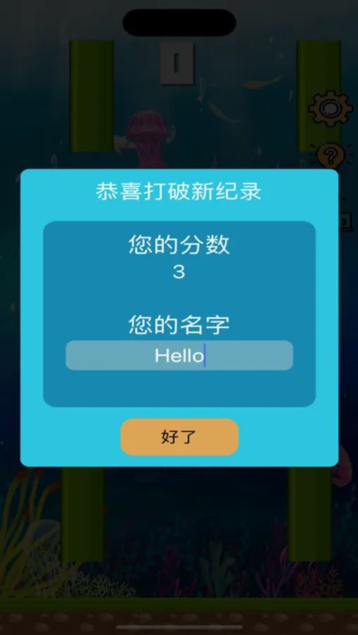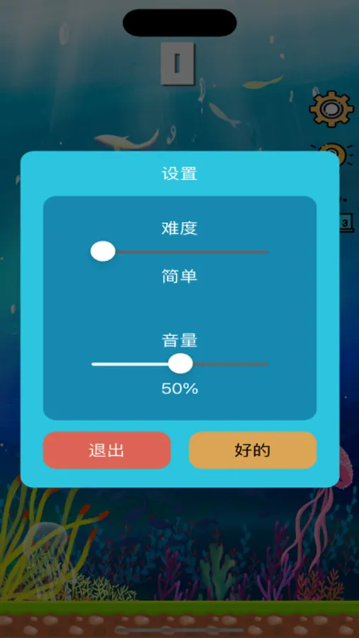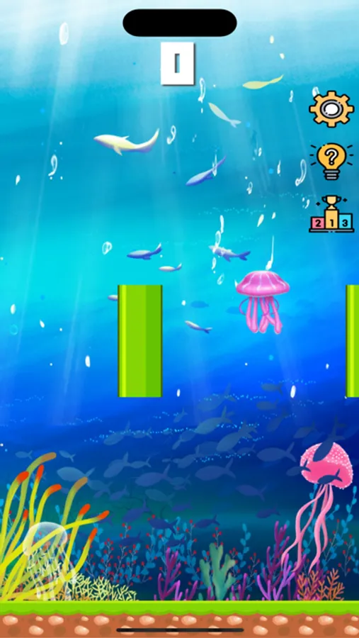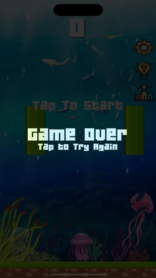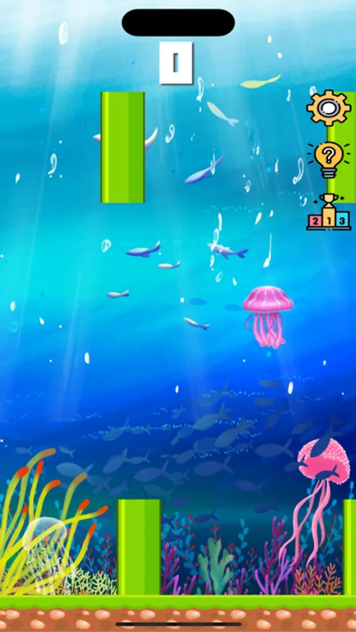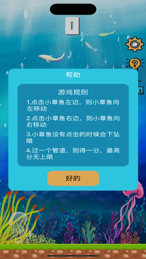 使其能不能上游,当掉落到海底,或者触碰到管道,则游戏结束,游戏有4个难度,不同的难度对应的下落速度和管道间隙不一样,难度越高,游戏
