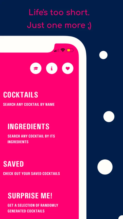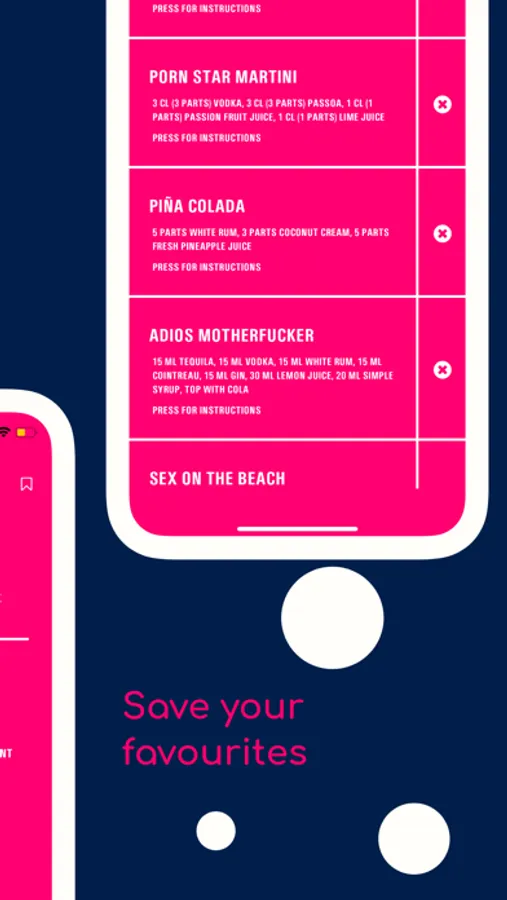 - Save your favourite cocktails and access this list without data or wifi.