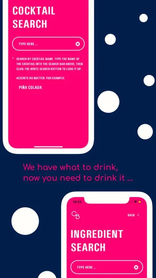 - Search cocktails by name, or the ingredients within them.