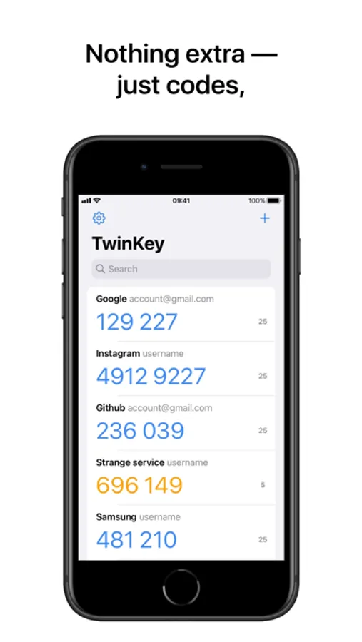 - User-Friendly Interface: TwinKey is designed for simplicity and efficiency. There are no folders or unnecessary icons — just the essential codes for your accounts.