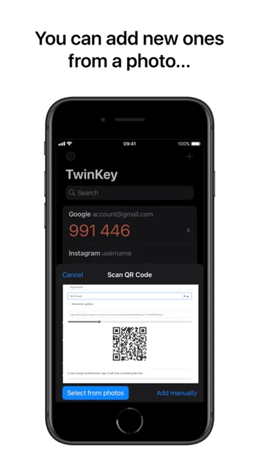- Easy Setup: Adding accounts to TwinKey is effortless. Simply scan QR codes using your device's camera, import images with embedded QR codes from your photo albums, or manually enter account information.