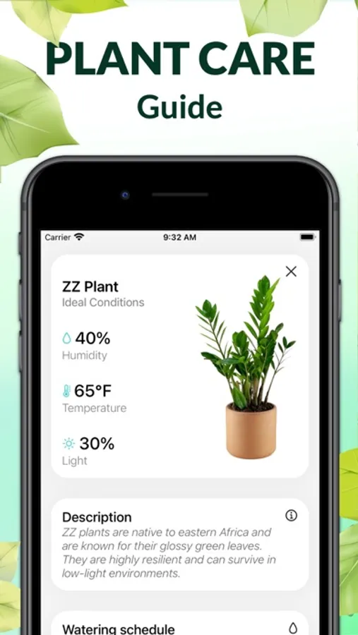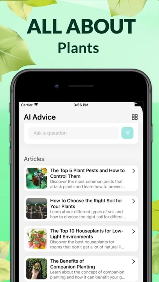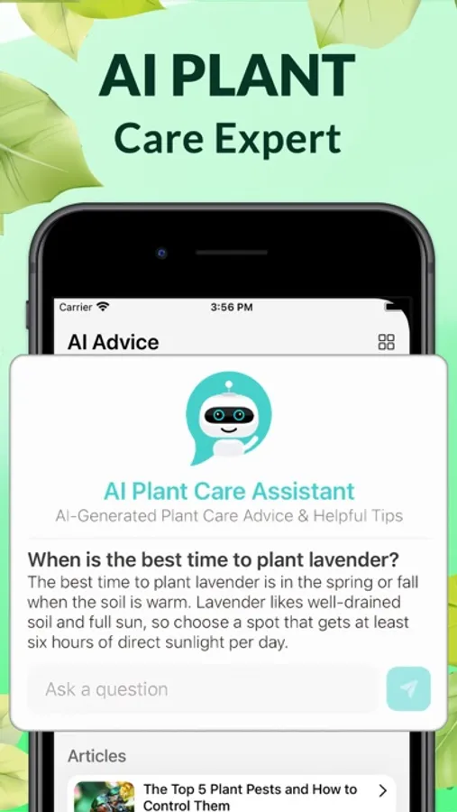 Stay on top of your plant's needs with personalized reminders for watering, and tips on optimal light and temperature conditions. Have a question? Our AI-powered assistant is ready to provide you with expert advice on demand.