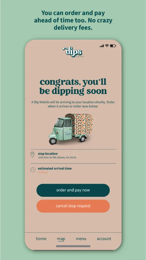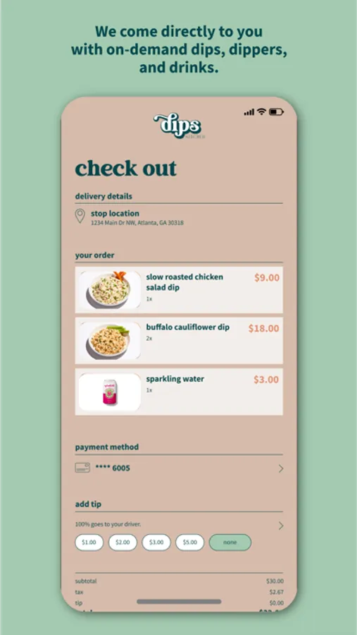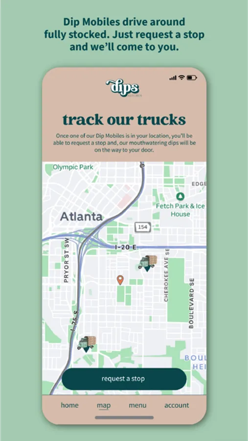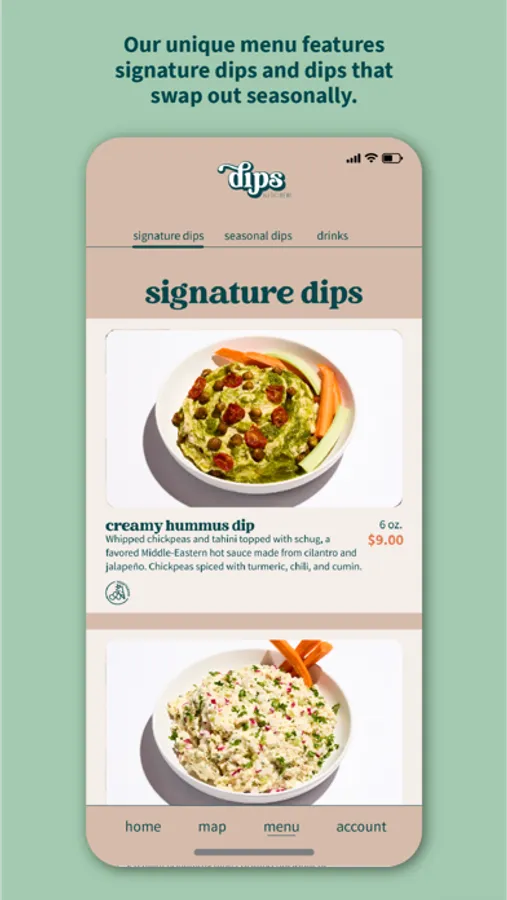 Our dips are packaged each morning and put on our Dip Mobiles™ outfitted with temperature control technology. The Dip Mobiles™ take off and head into different neighborhoods like savory ice cream trucks. Track the fleet using our custom location-based mobile app. You can wave one down or place an order through our app. Either way, we come directly to you with mouthwatering dips, dippers, and drinks with no delivery fee.