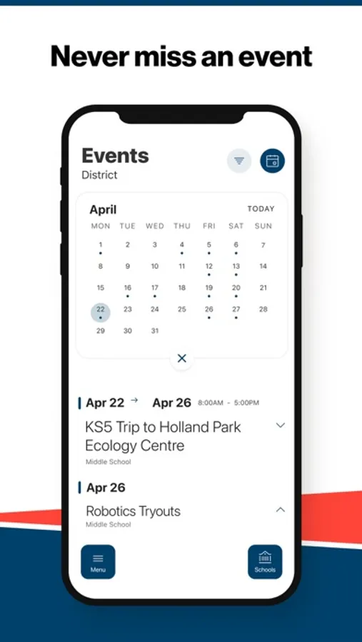 The event section shows a list of events throughout the district. Users can add an event to their calendar to share the event with friends and family with one tap.