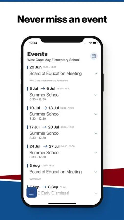 The event section shows a list of events throughout the district. Users can add an event to their calendar to share the event with friends and family with one tap.