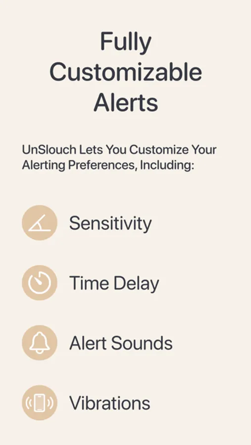 But UnSlouch doesn't stop there. We believe in customization and personalization. Tailor your UnSlouch experience by selecting alert sounds that suit your preferences. Adjust the slouch detection sensitivity to match your unique needs. You can even enhance alerts with vibration, providing an extra layer of feedback and encouragement.