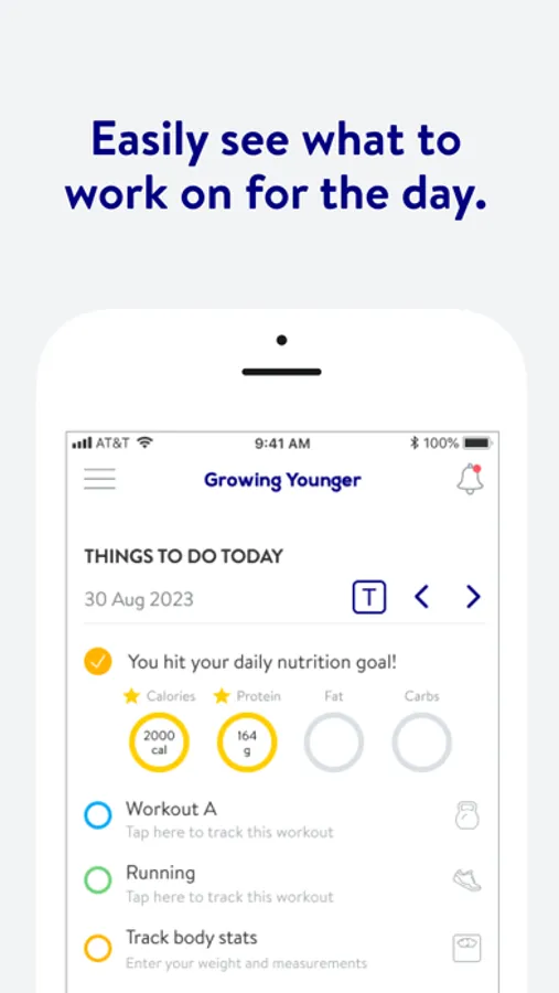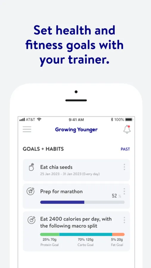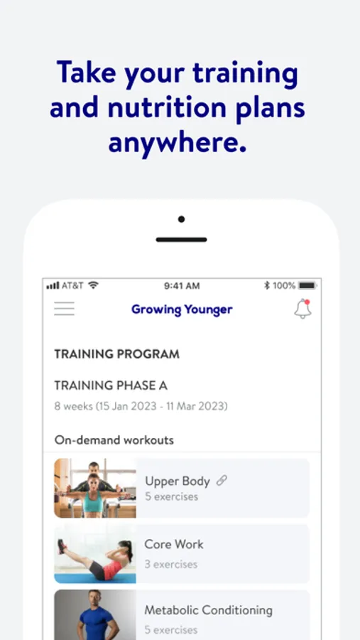 With the Growing Younger Fitness App for people Over 40, you will have access to workout programs designed specifically to help you reach your fitness and health goals! You can follow & track your workouts, your nutrition, your lifestyle habits, measurements and results–all with the help of your coach.