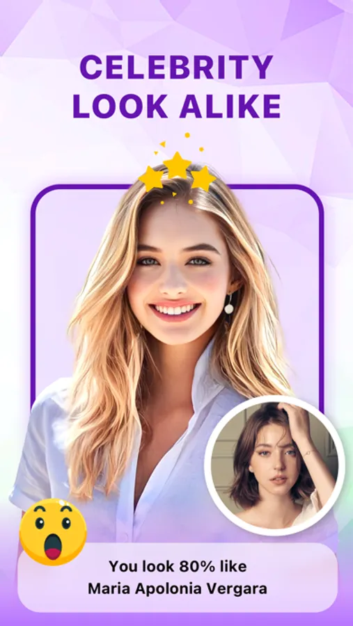 Celebrity Look-Alike: Prepare to be amazed! Our app employs advanced facial recognition algorithms to compare your features with those of renowned stars, unveiling the closest match to your own unique appearance. Discover your hidden doppelgänger among Hollywood's elite!