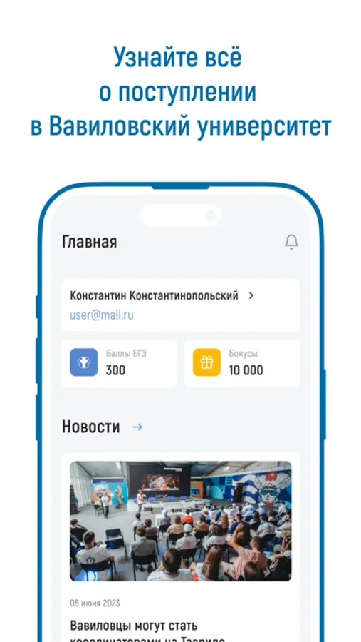 С помощью нашего приложения вы сможете быть в курсе всех новостей и мероприятий ВУЗа, за участие в которых вам будут начислять бонусные баллы, которые вы сможете обменять на фирменную атрибутику Вавиловского университета. Исходя из баллов за экзамены ЕГЭ подобрать себе подходящую специальность для поступления во время приёмной кампании, о подробностях проведения которой вы можете узнать из соответствующего раздела.
