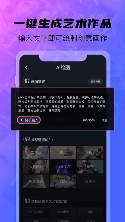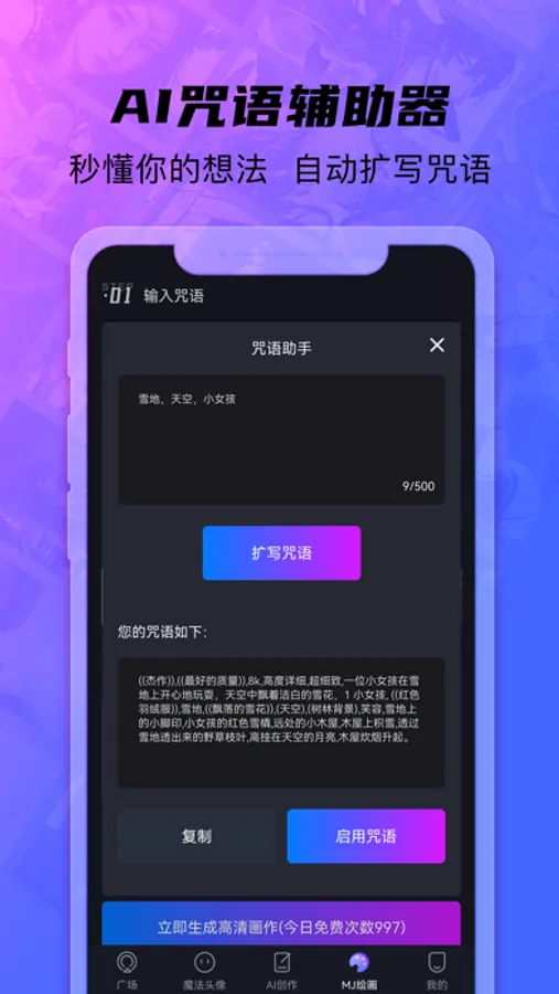 新增MJ大模型、咒语助手,图生图,除了文字,还可解析图片还原咒语,完美满足您对AI绘画的多种需求。超多风格可选:光影文字、超现实主义、以图生图、概念艺术、二次元、赛博朋克、国风等等,轻松作图,永不重复。