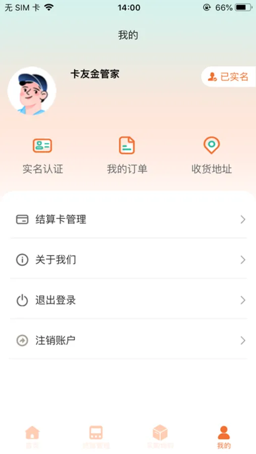 主要模块: 终端预警 交易查询 我的商户 终端管理 采购物料 实名认证 我的订单 收货地址 注销账户等