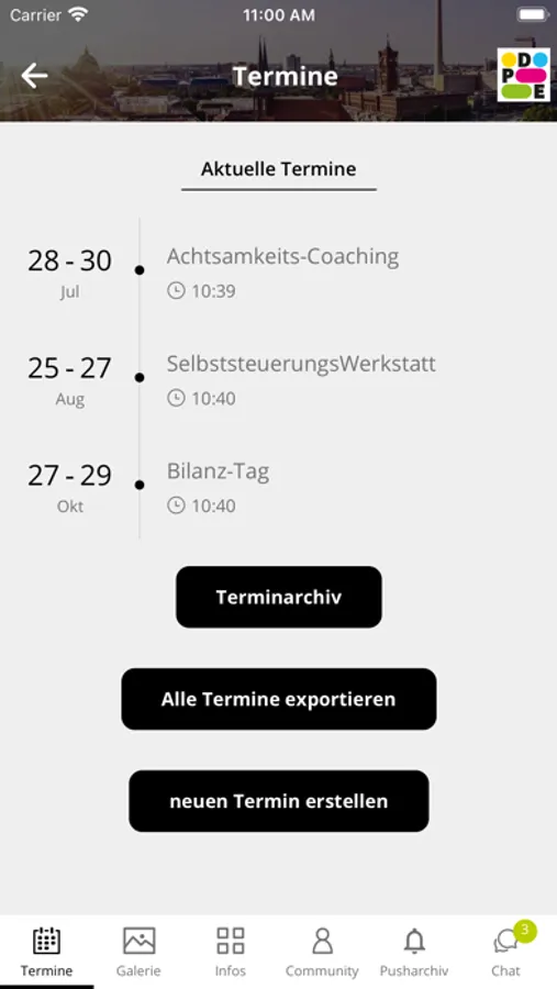 Die DPE App bietet den Unternehmen und ihren Teilnehmenden den Zugriff auf alle Inhalte im Rahmen der von uns angebotenen Potentialentwicklungsprogramme: Termine, Bilder, Unterlagen. Darüber hinaus können alle APP-User untereinander chatten und eigene Peer-Groups anlegen.