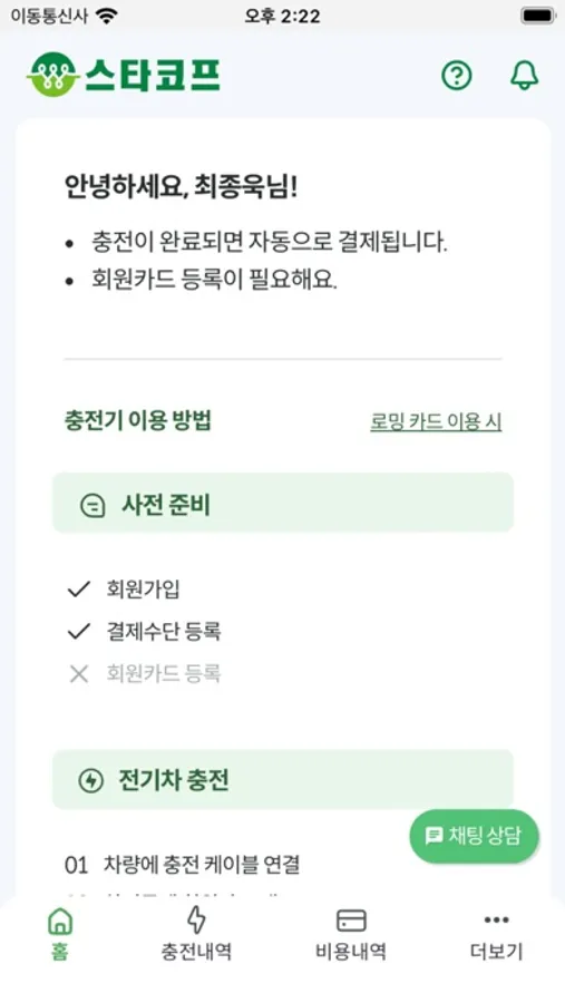 전기차 충전 진행 확인 및 충전내역 확인 등 스타코프 전기차 충전에 필요한 정보를 확인할 수 있습니다.