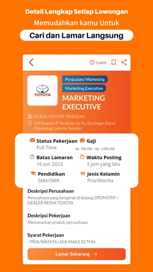 Jelajahi setiap lowongan kerja dengan detail yang jelas dan rinci. Kamu bisa melihat deskripsi pekerjaan, persyaratan, gaji, lokasi, dan informasi kontak perusahaan. Dan kamu dapat langsung mengirim CV ke perusahaan yang kamu tuju, gampang banget.