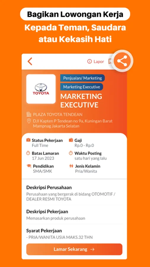 Bagikan lowongan kerja ke teman atau keluarga melalui berbagai platform media sosial seperti WhatsApp, Facebook, LinkedIn dan lainnya. Dengan fitur ini, kamu juga bisa membantu orang lain menemukan peluang karir yang menginspirasi.