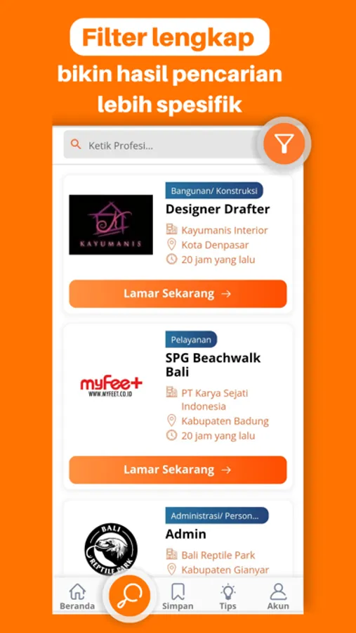Sesuaikan kriteria pencarian kamu dengan fitur filter yang lengkap. Kamu dapat menyaring hasil berdasarkan lokasi, lulusan, posisi atau kategori pekerjaan dan tingkat pendidikan. Walaupun kamu adalah seorang fresh graduate atau sudah berpengalaman kamu akan dengan mudah menggunakan aplikasi Loker Bali Info.