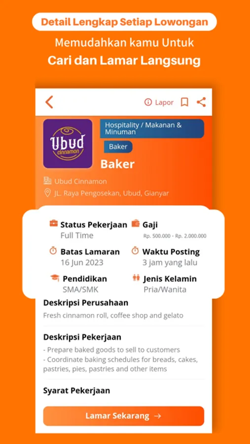 Jelajahi setiap lowongan kerja dengan detail yang jelas dan rinci. Kamu bisa melihat deskripsi pekerjaan, persyaratan, gaji, lokasi, dan informasi kontak perusahaan. Dan kamu dapat langsung mengirim CV ke perusahaan yang kamu tuju, gampang banget.