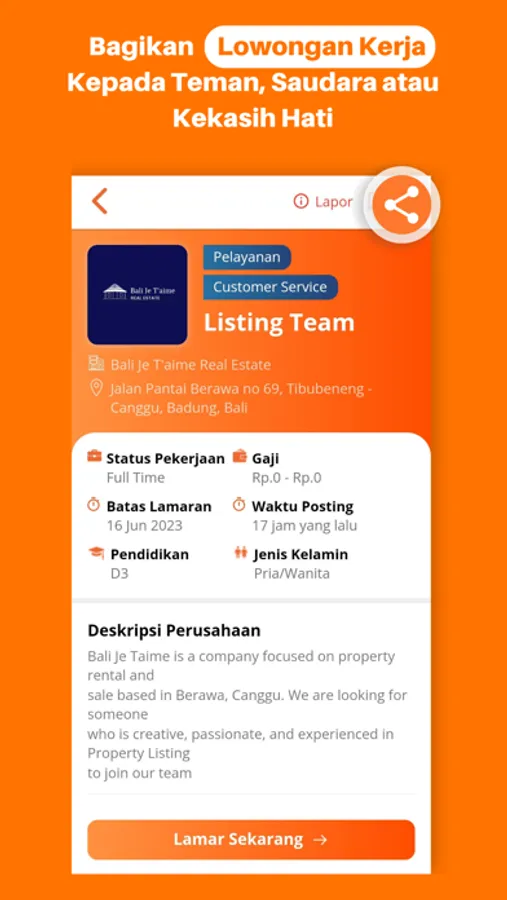 Bagikan lowongan kerja ke teman atau keluarga melalui berbagai platform media sosial seperti WhatsApp, Facebook, LinkedIn dan lainnya. Dengan fitur ini, kamu juga bisa membantu orang lain menemukan peluang karir yang menginspirasi.