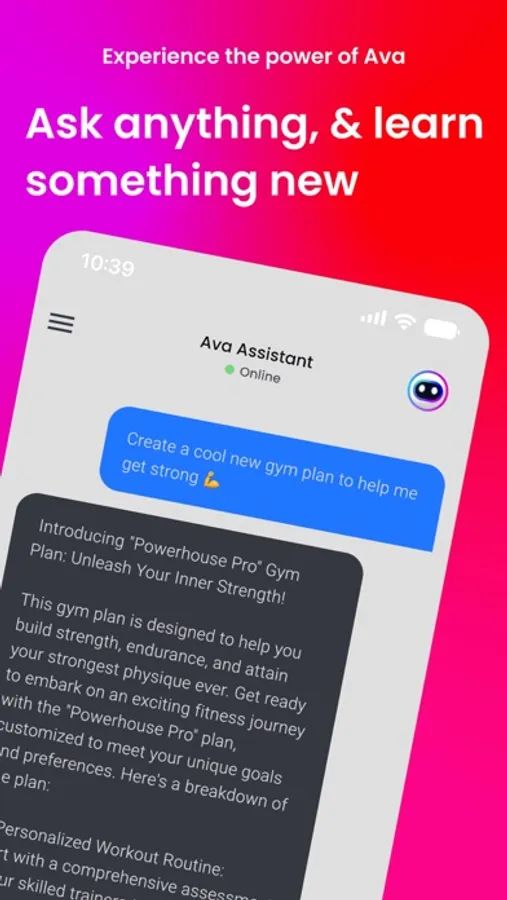 Ava - Assistant & Chatbot is now powered by the most advanced AI on the planet so it can maintain a new level of human-like interaction. Whether you are a gym lover looking for a new workout routine, or a new recipe for an upcoming date night.