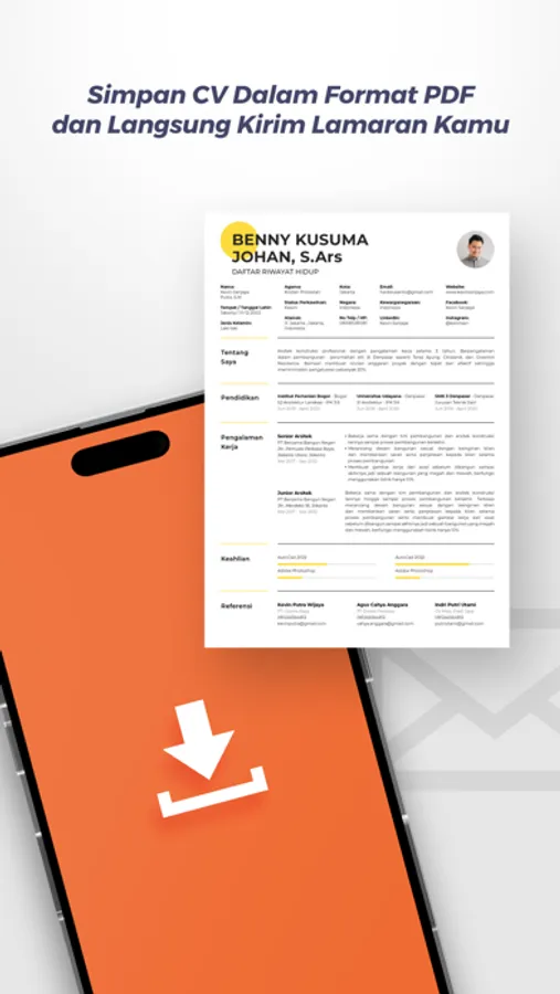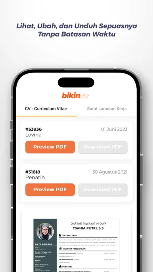 Di aplikasi BikinCV kamu bisa dengan mudah untuk Buat, Ubah dan Lihat CV kamu sebelum kamu unduh. Kamu bisa sesuaikan dengan posisi yang akan kamu lamar.