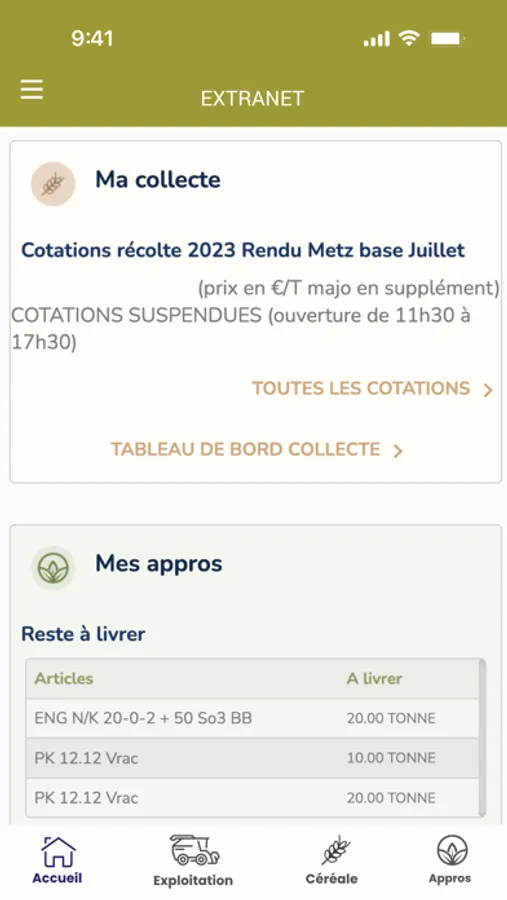 Grâce à l'application mobile Agrifim, vous pourrez vous connecter à votre espace pour y retrouver toutes vos informations de compte et restez en contact avec votre négoce agricole. Vous y retrouvez les dernières actualités de votre négoce agricole Agrifim. Vous pourrez aussi consulter l'état de vos comptes, l'historique de vos contrats et commandes. Vous pourrez aussi voir vos livraisons et votre reste en dépôt ou encore analyser la météo agricole. Retrouvez également les FDS de vos produits commandés ainsi que vos cotations.