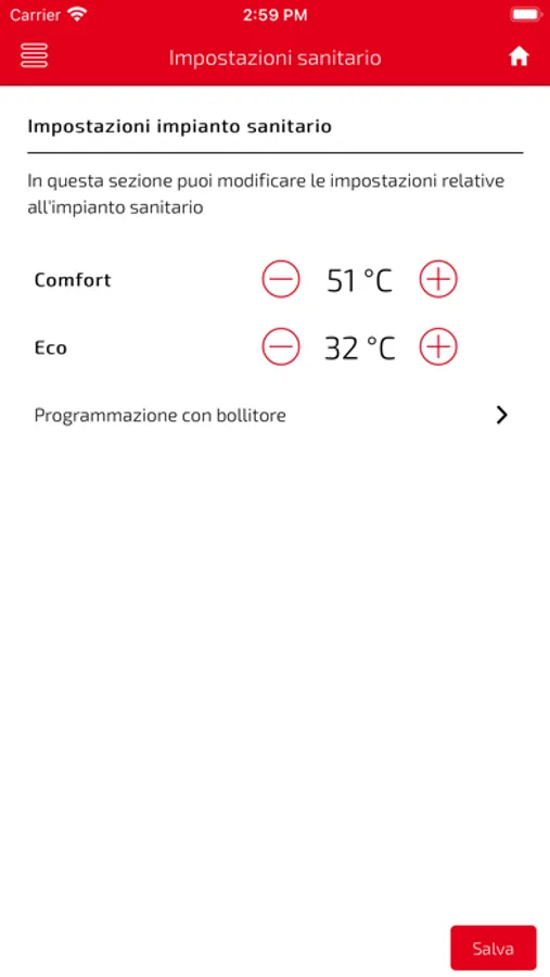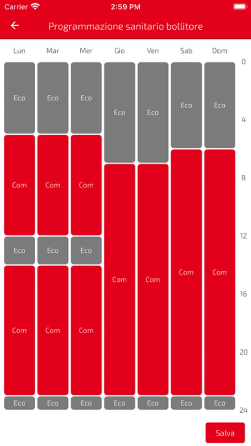 Dalla pagina della programmazione oraria è possibile impostare le varie fasce orarie per il riscaldamento e per il sanitario.