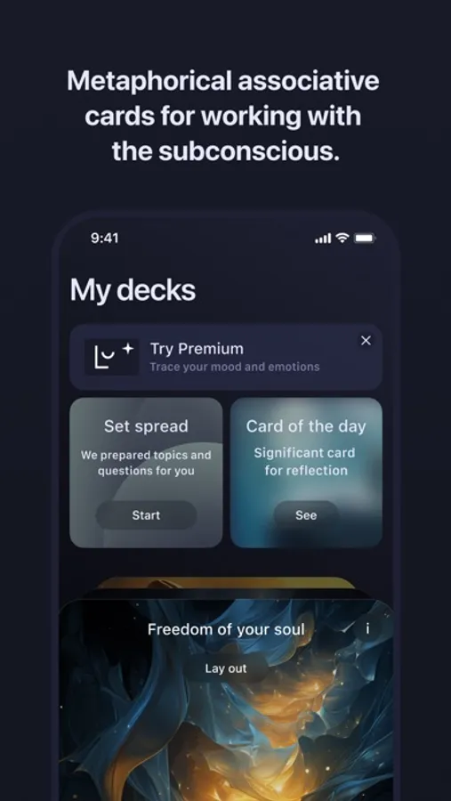• Metaphorical cards: Carefully designed images rich in symbolism speak directly to your subconscious, bypassing conscious mental blocks and helping you find clear answers.
