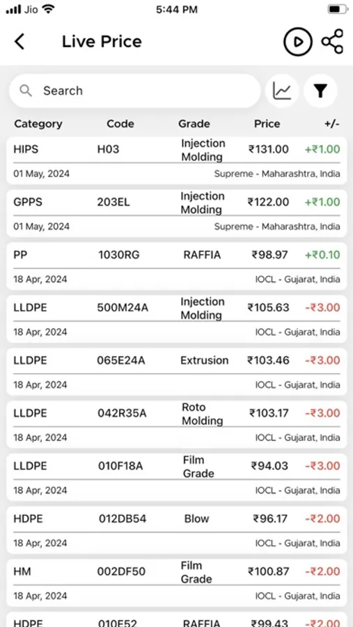 Live Price: Check daily live polymer price update of PP Price, LDPE Price, PVC Price, HDPE Price, and all polymers price list in a table and graph format. Also, we’ll share by notification feature.